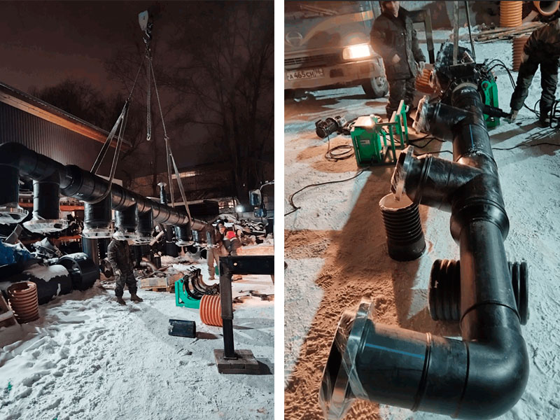 Коллектор, который мы изготовили, представляет собой сложную конструкцию, состоящую из сваренных между собой фитингов из полиэтилена низкого давления (ПНД). К его составу входят отводы, тройники и редукционные переходы, которые обеспечивают надежное соединение и оптимизацию потоков в системе. Несмотря на то, что конструкция может показаться простой, ее габариты добавили сложности в процесс производства.